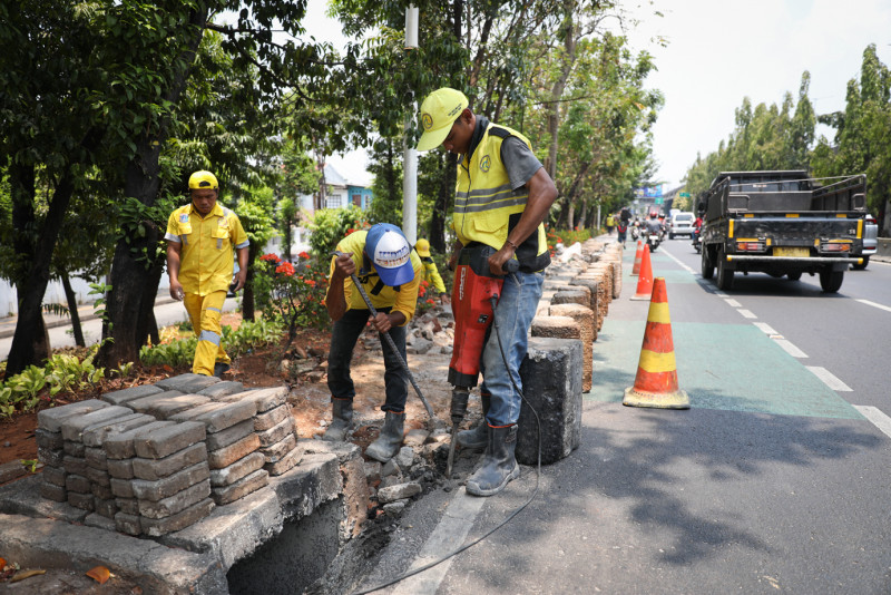 Petugas Suku Dinas Bina Marga Jakarta Timur mengerjakan revitalisasi trotoar di Jalan Jenderal Ahmad Yani, Matraman, Jakarta Timur, Senin (23/10). Revitalisasi meliputi peninggian badan trotoar dan pemasangan paving block untuk memberikan keamanan dan kenyamanan bagi pejalan kaki.