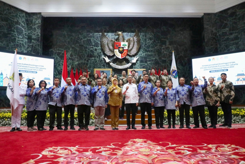Penjabat (Pj) Gubernur DKI Jakarta, Heru Budi Hartono melepas kontingen Seleksi Tilawatil Quran dan Al-Hadist (STQH), Swayamvara Tripitaka Gatha (STG), dan Pesta Paduan Suara Gerejani (Pesparani) Katolik DKI Jakarta Tahun 2023 yang akan mengikuti laga nasional, di Balai Kota Jakarta, pada Selasa (24/10). Pj Gubernur berharap, seluruh kontingen dapat meraih juara dan mengharumkan nama Provinsi DKI Jakarta.