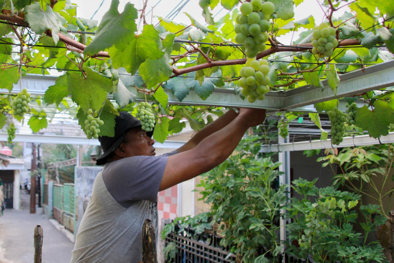 Melihat budi daya buah anggur di Poktan Blongsong Farm Edukasi, Jalan Damai, RT 09/05, Petukangan Selatan, Pesanggrahan, Jakarta Selatan. Ditempat ini terdapat puluhan jenis tanaman buah anggur yang dibudidayakan diantaranya seperti, Jupiter, transfigursi, ninel, nemas, black jumbo, kyoho dan masih banyak lagi.