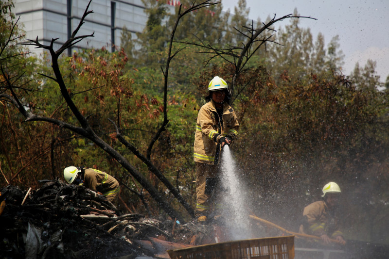 Suku Dinas Penanggulangan Kebakaran dan Penyelamatan (Sudin Gulkarmat) Jakarta Timur melakukan proses pendinginan lokasi kebakaran di Jalan Perintis Kemerdekaan RT 01/15, Kelurahan Kayu Putih, Pulogadung, Jakarta Timur, Senin (23/10). Sudin Gulkarmat Jaktim mengerahkan 44 personel dan lima mobil damkar.