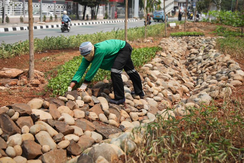 Petugas Penanganan Prasarana dan Sarana Umum (PPSU) Srengseng Sawah menyelesaikan penataan kawasan unggulan triwulan IV di Jalan Lenteng Agung Barat, Srengseng Sawah, Jagakarsa, Jakarta Selatan. Lokasinya yang selalu terkena sinar matahari, penataan kawasan unggulan triwulan IV Kelurahan Srengseng Sawah mengusung tema taman semi kering dengan menanam sejumlah tanaman hias dan pohon buah yang memang tahan akan suhu panas.