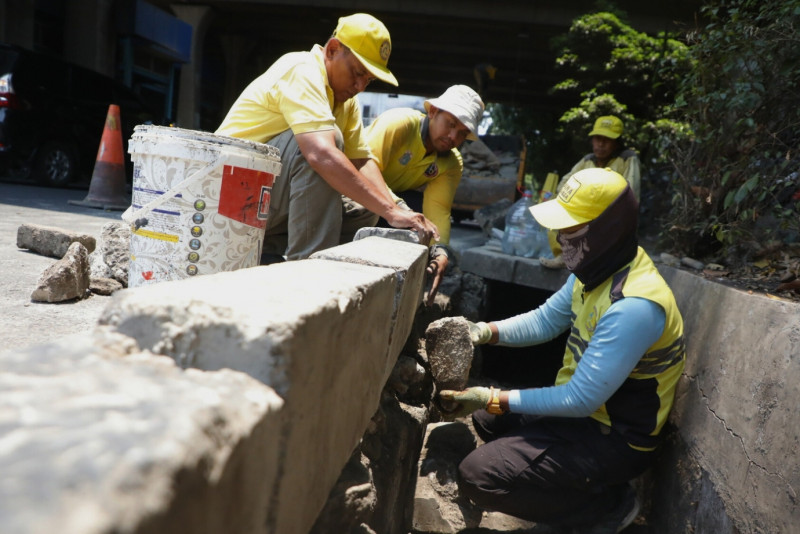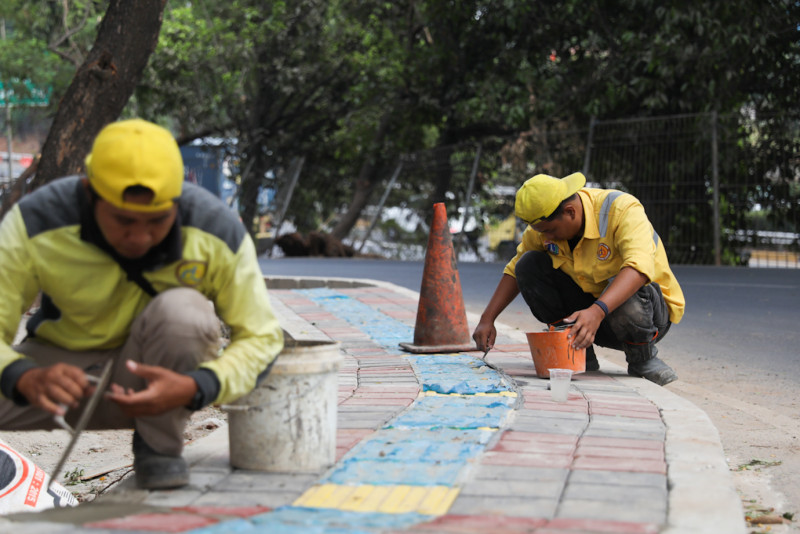 Petugas Suku Dinas (Sudin) Bina Marga Jakarta Timur memperbaiki kanstin di Jalan Raya Stasiun Cakung, Pulo Gebang, Sabtu (21/10). Perbaikan kanstin ini dilakukan karena banyak kanstin yang rusak akibat tertabrak kendaraan. Dengan adanya perbaikan ini diharapkan dapat memberikan kenyamanan dan keamanan bagi pengendara yang melintas.