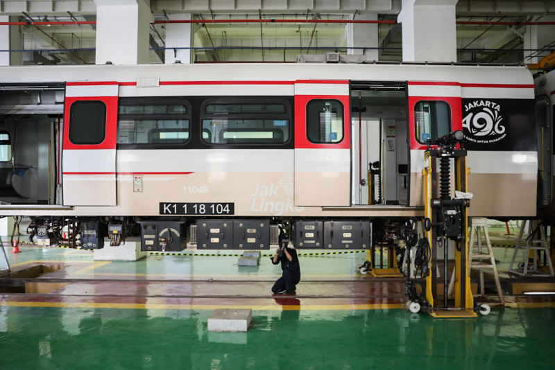 Sejumlah teknisi melakukan perawatan kereta LRT Jakarta atau light rail vehicle (LRV) di Depo LRT Jakarta Pegangsaan Dua, Kelapa Gading, Jakarta, Utara. Kereta LRT Jakarta menjalani dua jenis perawatan rutin, yaitu perawatan ringan (light maintenance) yang dilakukan setiap 7 hari dan 4 bulan, serta perawatan berat (heavy maintenance) yang dilakukan setiap 4 dan 8 tahun oleh Divisi Sarana LRT Jakarta.