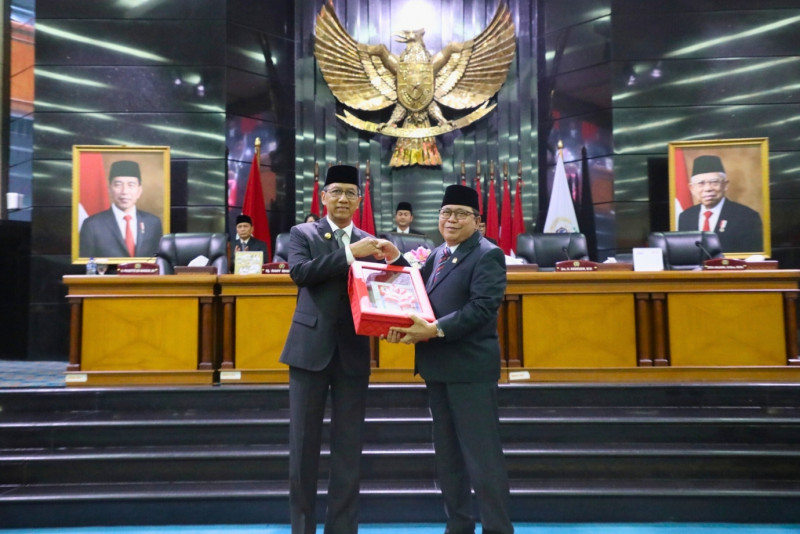 Penjabat Gubernur (Pj) DKI Jakarta, Heru Budi Hartono menghadiri Rapat Paripurna DPRD DKI Jakarta di Ruang Rapat Paripurna DPRD DKI Jakarta, Senin (23/10). Paripurna ini beragendakan penyampaian Penjelasan Pj Gubernur tentang empat Rancangan Peraturan Daerah (Raperda) antara lain Raperda