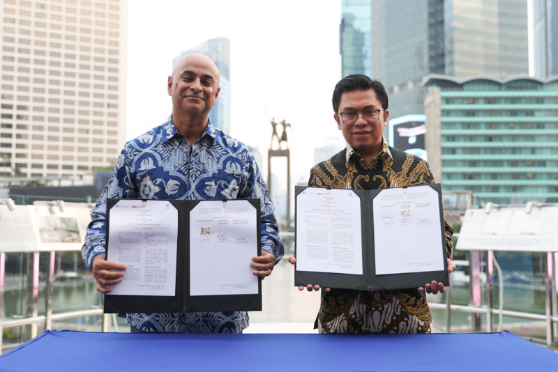 PT Transjakarta bersama Thunderbird School of Global Management, Arizona State University melakukan penandatanganan nota kesepahaman dalam program 100 Million Learners di Halte Bundaran HI, Menteng, Jakarta Pusat, Kamis (19/10). Kerja sama ini dilakukan untuk meningkatkan kualitas SDM PT Transjakarta melalui akses-akses pelatihan yang berkualitas dan setara kepada seluruh karyawan dan pelanggan bus menggunakan platform program 100 Million Learners.
