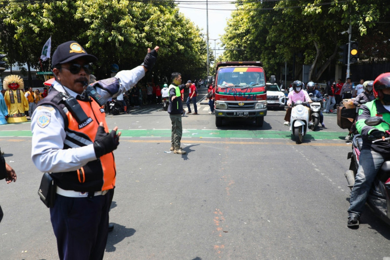 Petugas Satuan Polisi Pamong Praja (Satpol PP) dan Suku Dinas Perhubungan (Sudinhub) Jakarta Pusat untuk membantu pengamanan dan kelancaran lalu lintas dalam tahapan pendaftaran calon presiden (Capres) dan calon wakil presiden (Cawapres) 2024-2029, di kawasan Kantor Komisi Pemilihan Umum (KPU) Pusat, Jalan Imam Bonjol, Jakarta Pusat, Kamis (19/10). Dalam kegiatan ini sebanyak 33 personel satpol PP dan 60 petugas Sudinhub Jakarta Pusat bahu membahu membantu pengamanan dan menjaga ketertiban umum serta pengaturan arus lalu lintas.