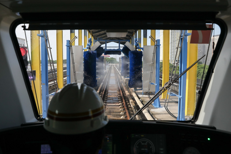 Kereta Light Rail Transit (LRT) Jakarta melintas mesin Automatic Train Washing Plant (ATWP) untuk melakukan proses pencucian eksterior kereta di Depo LRT Jakarta Pegangsaan Dua, Kelapa Gading, Jakarta Utara. Mesin ATWP berjalan secara otomatis setelah masinis menjalankan kereta dan mengatur jumlah trainset yang akan dicuci.
