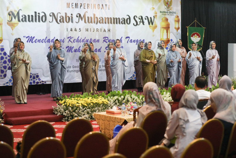 Dharma Wanita Persatuan (DWP) DKI Jakarta menggelar peringatan Maulid Nabi Muhammad SAW 1445 Hijriah di Aula Gedung Nyi Ageng Serang, Setiabudi, Jakarta Selatan, Rabu (18/10). Peringatan Maulid yang mengangkat tema Meneladani Kehidupan Rumah Tangga Nabi Muhammad SAW ini diisi tausiah keagamaan oleh Ustad Zaky Mubarok.