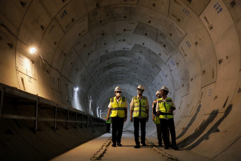 Penjabat (Pj) Gubernur Provinsi DKI Jakarta, Heru Budi Hartono meninjau proyek pembangunan MRT Jakarta Fase 2A CP201 dari Stasiun Monas sampai Thamrin, Rabu (18/10). Heru mengatakan, progres pembangunan MRT Jakarta Fase 2A CP201 Bunderan HI - Harmoni sudah mencapai 62 persen, sedangkan Fase 2A CP202 Harmoni - Kota mencapai 26 persen.