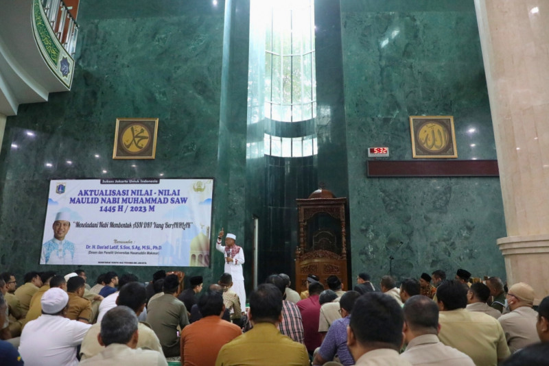 Sekretariat Dewan Pengurus Korps Pegawai Republik Indonesia (Korpri) DKI Jakarta menggelar kegiatan aktualisasi nilai-nilai Maulid Nabi Muhammad SAW Tahun 2023 di Masjid Fatahillah, Balai Kota DKI Jakarta, Selasa (10/10). Kajian digelar dalam rangga memperingati kelahiran Nabi Muhammad SAW dengan mengusung tema \" Meneladani Nabi membentuk ASN DKI yang Berakhlak\", dengan penceramah, Ustaz Das\'ad Latif. Diharapkan dengan adanya kajian ini para jemaah dapat meneladani sifat- sifat Nabi Muhammad untuk meningkatkan nilai spiritual ASN DKI Jakarta.