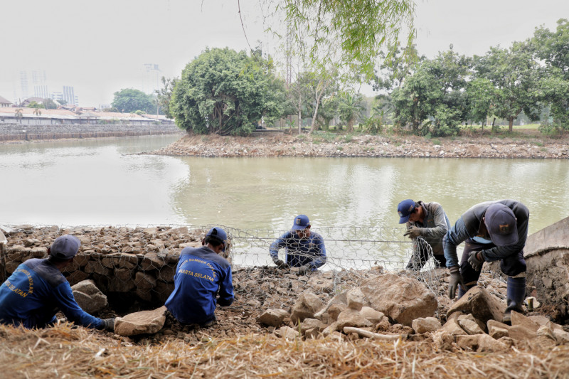 Suku Dinas Sumber Daya Air (Sudin SDA) Jakarta Selatan melakukan pemasangan turap bronjong di Waduk Marinir Denjaka, Cilandak Timur, Pasar Minggu, Jakarta Selatan, Senin (9/10). Pemasangan bronjong dilakukan pada sisi selatan waduk, dengan total pengerjaan sepanjang 274 meter serta ketinggian 3 meter.
