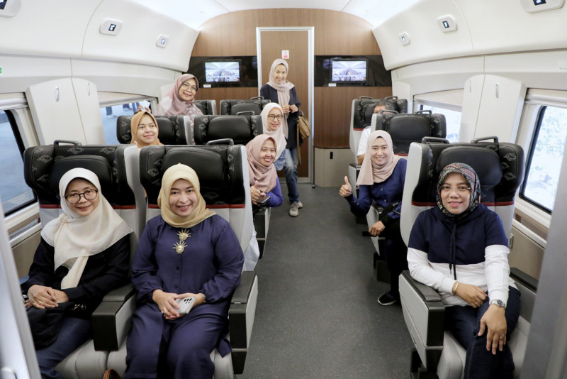 Dharma Wanita Persatuan (DWP) Provinsi DKI Jakarta menjajal Kereta Cepat Whoosh Jakarta-Bandung, Kamis (5/10). Perjalanan dimulai dari Stasiun Kereta Cepat Halim, Jakarta Timur menuju Stasiun Kereta Cepat Tegalluar, Bandung, Jawa Barat.