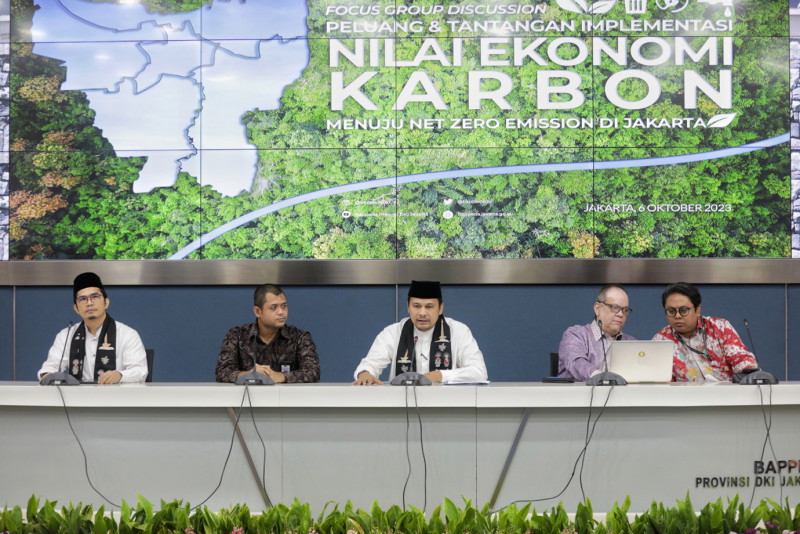 Pemerintah Provinsi (Pemprov) DKI Jakarta menggelar Focus Group Discussion (FGD) untuk membahas terkait Peluang dan Tantangan Implementasi Nilai Ekonomi Karbon (NEK) menuju Net Zero Emission di Jakarta di Ruang Pola, Gedung Blok G, Balai Kota, Jakarta Pusat, Jumat (6/10). kegiatan ini dihadiri lebih dari 100 peserta dari berbagai instansi.