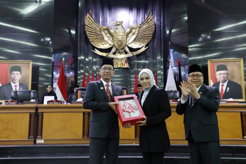 Penjabat (Pj) Gubernur DKI Jakarta, Heru Budi Hartono menyerahkan Rancangan Peraturan Daerah (Raperda) tentang Anggaran Pendapatan dan Belanja Daerah (APBD) DKI Jakarta Tahun Anggaran (TA) 2024 kepada Pimpinan Dewan Perwakilan Rakyat Daerah (DPRD) DKI dalam Rapat Paripurna di gedung DPRD DKI, Jakarta Pusat, Kamis (5/10). Raperda tersebut diterima oleh Wakil Ketua DPRD DKI Jakarta, Zita Anjani yang menjadi pimpinan Rapat Paripurna, didampingi Wakil Ketua DPRD lainnya, Misan Samsuri.