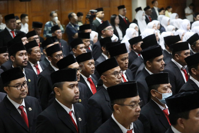 Penjabat (Pj) Gubernur DKI Jakarta, Heru Budi Hartono kembali melantik dan mengambil sumpah jabatan 321 Pejabat Administrator, Pengawas serta Fungsional di lingkungan Pemprov DKI Jakarta, Kamis (4/10). Ratusan aparatur yang dilantik di Balai Kota tersebut terdiri dari 26 pejabat eselon III, 280 pejabat eselon IV serta 13 pejabat fungsional Dinas Kesehatan dan dua pejabat fungsional Dinas Pendidikan.