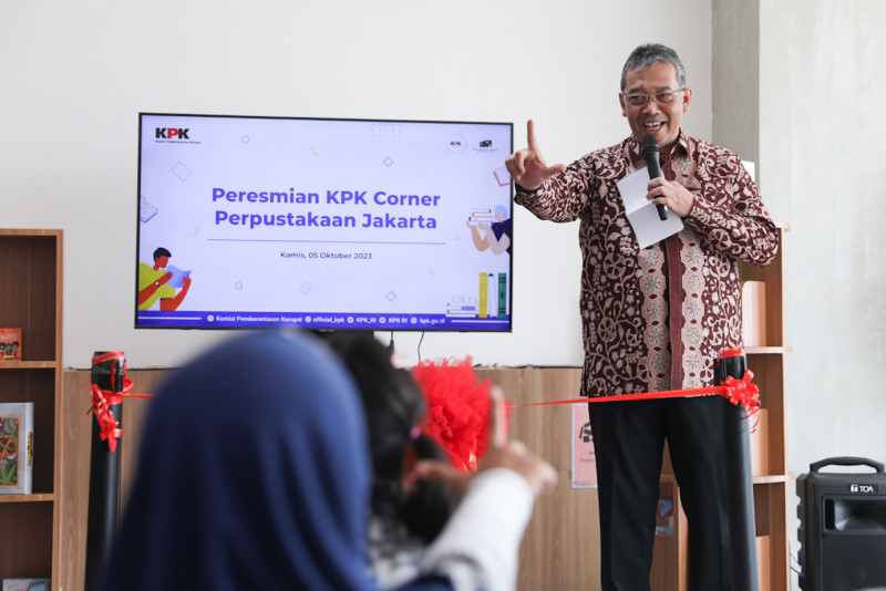 Kepala Dinas Perpustakaan dan Kearsipan (Dispusip) DKI Jakarta, Firmansyah bersama Kepala Biro Humas Komisi Pemberantasan Korupsi (KPK), Yuyuk Andriati Iskak meresmikan KPK Corner di Perpustakaan Jakarta, Taman Ismail Marzuki (TIM), Cikini, Menteng, Jakarta Pusat, Kamis (5/10). KPK Corner merupakan pojok baca dan bermain tentang edukasi antikorupsi untuk anak-anak dan umum.
