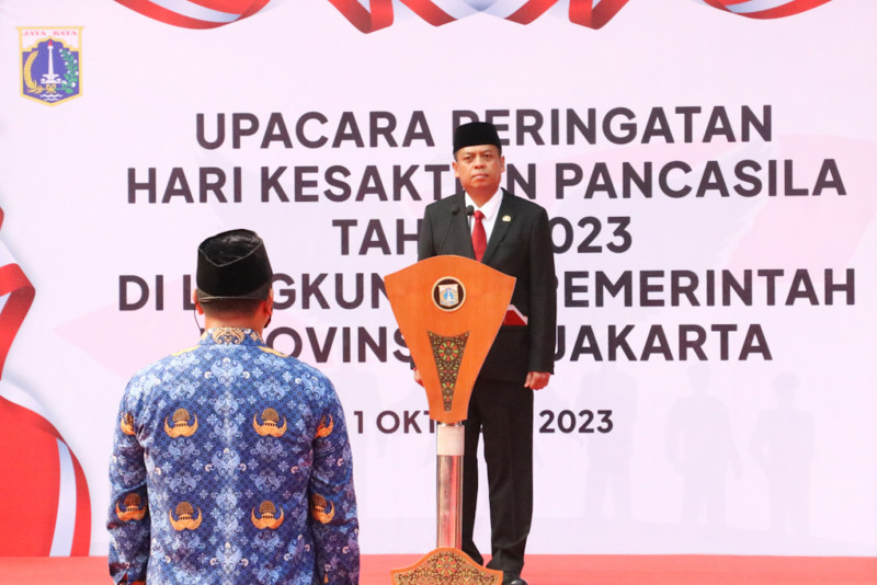 Pemerintah Provinsi (Pemprov) DKI Jakarta melaksanakan upacara peringatan Hari Kesaktian Pancasila di halaman Balai Kota DKI Jakarta, Gambir, Jakarta Pusat, Minggu (1/10). Sekretaris Daerah (Sekda) Provinsi DKI Jakarta, Joko Agus Setyono, bertindak sebagai inspektur upacara (Irup) dalam upacara yang diikuti oleh ratusan ASN Pemprov DKI tersebut.