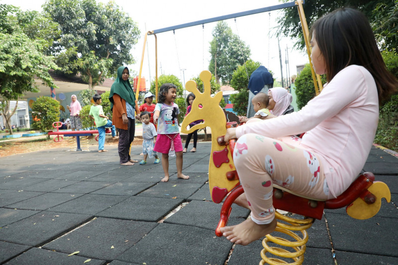 Sejumlah warga menikmati waktu akhir pekan dengan mengunjungi Ruang Publik Terpadu Ramah Anak (RPTRA) Pondok Kelapa Berseri, Pondok Kelapa, Duren Sawit, Jakarta Timur, Minggu (1/10). Di RPTRA seluas 1.700 meter persegi ini, pengunjung dapat menikmati beragam fasilitas menarik mulai dari wahana bermain, sarana olahraga, hingga perpustakaan.