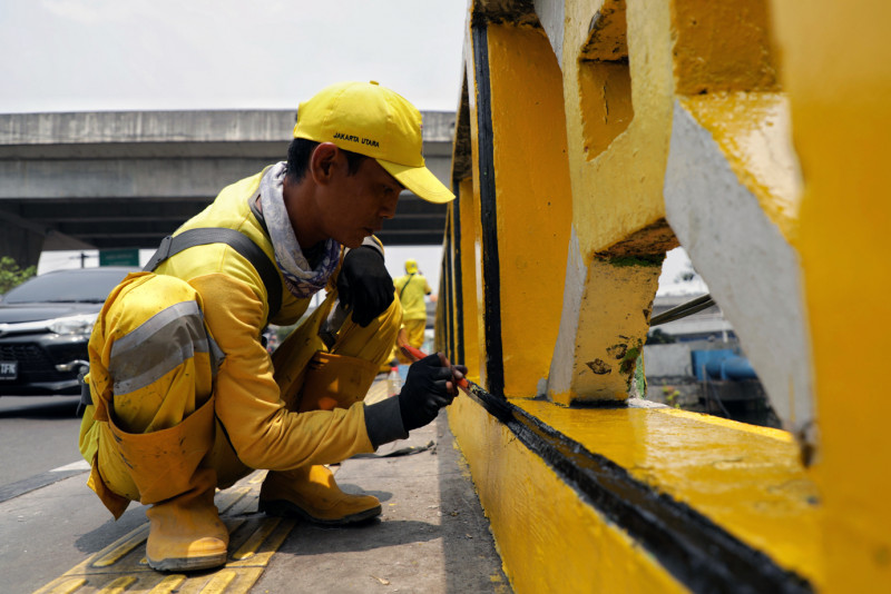 Satuan Pelaksana (Satpel) Bina Marga Kecamatan Koja, Jakarta Utara, Senin (2/10), melakukan pengecatan pembatas jembatan di Jalan Plumpang Semper, Kelurahan Rawa Badak Selatan. Pengecatan pembatas jembatan tersebut merupakan perawatan rutin agar lingkungan selalu terlihat bersih dan rapi.