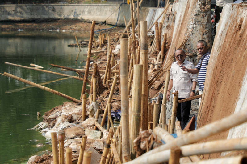 Sekretaris Komisi D Dewan Perwakilan Rakyat Daerah (DPRD) Provinsi DKI Jakarta, Syarif mengecek perbaikan turap Waduk Rawa Bambon di Jalan Rawa Bambon, RT 10/04, Kelapa Dua Wetan, Ciracas, Jakarta Timur, Sabtu (30/9). Pengecekan dilakukan untuk memastikan kontraktor dapat segera menyelesaikan perbaikan turap tersebut.