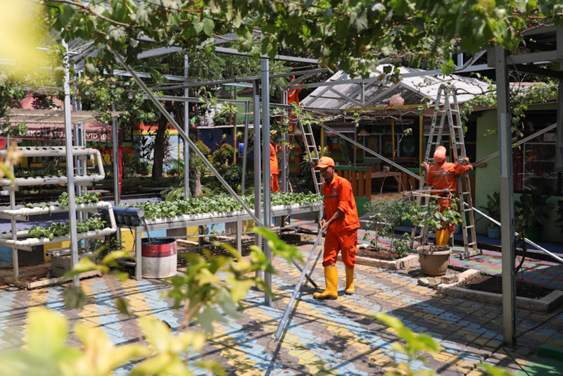 Petugas Penanganan dan Sarana Umum (PPSU) Kelurahan Ciracas membangun green house di halaman Kantor Kelurahan Ciracas, Kecamatan Ciracas, Jakarta Timur, Kamis (28/9). Pembangunan green house seluas 32 meter persegi tersebut dimanfaatkan untuk budidaya anggur dan sayuran pakcoi dengan instalasi hidroponik.