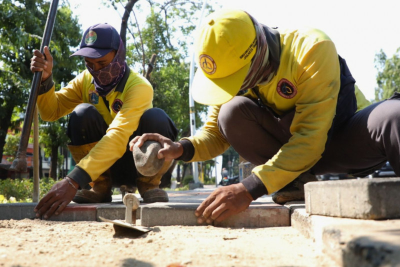 Suku Dinas (Sudin) Bina Jakarta Timur memperbaiki trotoar di Jalan Ahmad Yani, Pisangan Baru, Matraman, Kamis (28/9). Perbaikan trotoar sepanjang 300 meter dan lebar 120 senti meter ini diperbaiki oleh 12 petugas sejak 25 September dan ditargetkan rampung selama dua minggu.