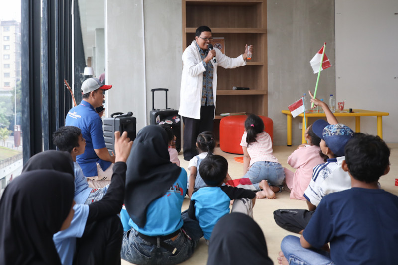 Sejumlah anak-anak dari Bale Buku Jakarta mengunjungi Perpustakaan Jakarta di Taman Ismail Marzuki (TIM), Menteng, Jakarta Pusat, Sabtu (23/9). Dalam kunjungannya ke Perpustakaan Jakarta, anak-anak mendengarkan dongeng dan bermain permainan edukatif di area bermain anak.