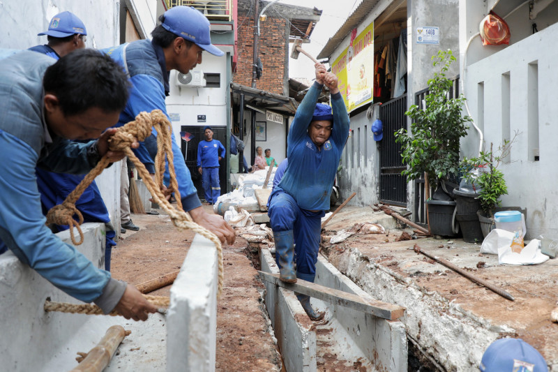 Petugas Suku Dinas Sumber Daya Air (Sudin SDA) Jakarta Selatan memperbaiki saluran air di Jalan Haji Saren, Grogol Selatan, Kebayoran Lama, Jakarta Selatan, Jumat (22/9). Perbaikan saluran sepanjang 67 meter dengan cara pemasangan uditch baru.