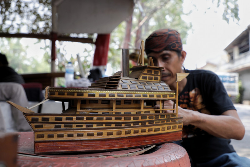 Eko Budi Pramono, Warga RT 06/04, Kemanggisan, Palmerah, menyelesaikan pembuatan miniatur di Jalan Palmerah 1, Kemanggisan, Palmerah, Jakarta Barat. Eko memanfaatkan limbah bambu menjadi kerajinan miniatur seni yang berkualitas seperti kapal, rumah adat, pesawat dan lainnya. Kegiatan ini sudah ditekuninya sejak 2018.