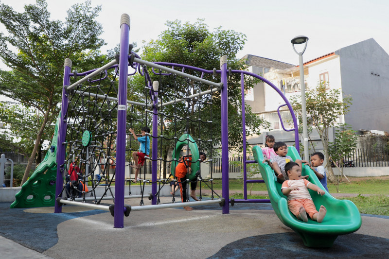 Sejumlah warga berkunjung ke Taman Warung Silah di Jalan Warung Silah, Cipedak, Jagakarsa, Jakarta Selatan, Jumat (15/9). Taman yang teduh dan asri ini banyak dimanfaatkan warga sekitar sebagai sarana bermain anak, berolahraga ataupun sekedar santai-santai menikmati waktu sore.