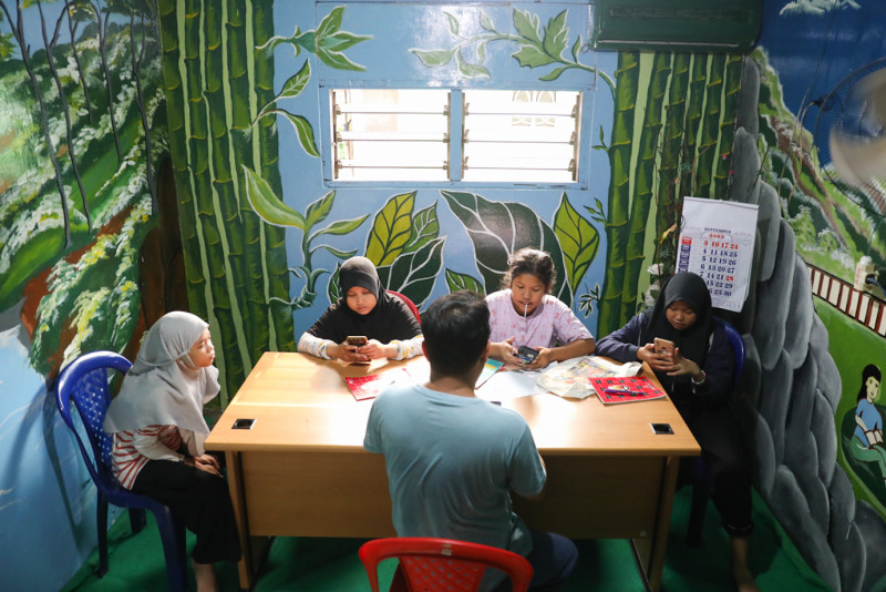 Sejumlah anak-anak mengikuti bimbingan belajar (bimbel) di Bimbingan Belajar Berbayar Sampah Terpilah dan Terpilih (B3STT) di Sekretariat RW 06, Kelurahan Kebon Melati, Tanah Abang, Jakarta Pusat, Kamis (14/9). Sebanyak 35 anak mulai dari kelas 1 hingga kelas 11 mengikuti bimbel dan membayarnya dengan sampah.