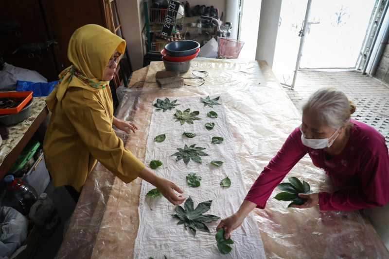 Sejumlah perajin mengerjakan pembuatan beragam produk kriya dengan teknik ecoprint di bengkel kerja (worskhop) Kinrose Craft, Cilandak, Jakarta Selatan, Senin (11/9). Kinrose Craft merupakan salah satu UMKM yang menjadi anggota Jakpreneur binaan Dinas Perindustrian, Perdagangan, Koperasi, Usaha Kecil dan Menengah (PPKUKM) DKI Jakarta. Sebanyak 367.769 pelaku UMKM yang telah terdaftar sebagai anggota Jakpreneur terus didorong Pemprov DKI Jakarta untuk mengembangkan usaha dan meningkatkan kualitas produknya agar menjadi lebih baik lagi.