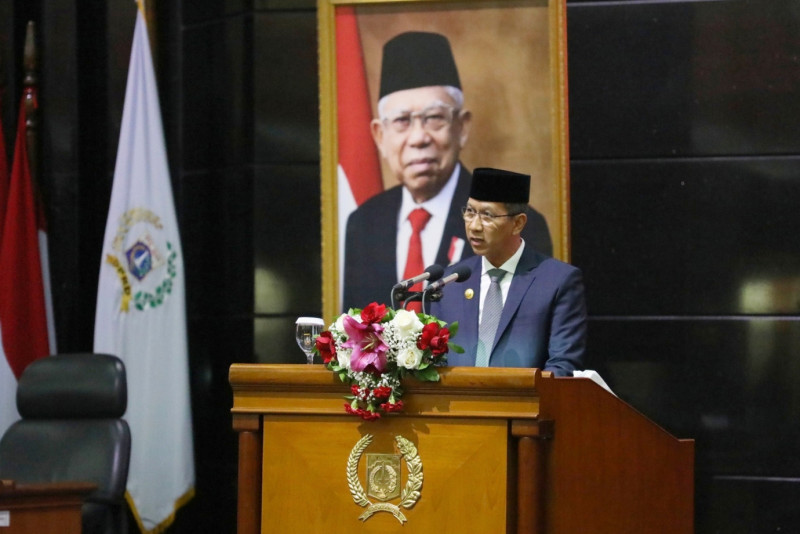Penjabat (PJ) Gubernur DKI Jakarta, Heru Budi Hartono menghadiri rapat paripurna di Ruang Rapat DPRD DKI Jakarta, Jalan Kebon Sirih, Gambir, Jakarta Pusat, Senin (11/9). Rapat Paripurna beragendakan penyampaian pidato Pj Gubernur mengenai Rancangan Peraturan Daerah (Raperda) tentang perubahan APBD Provinsi DKI Jakarta Tahun Anggaran 2023.