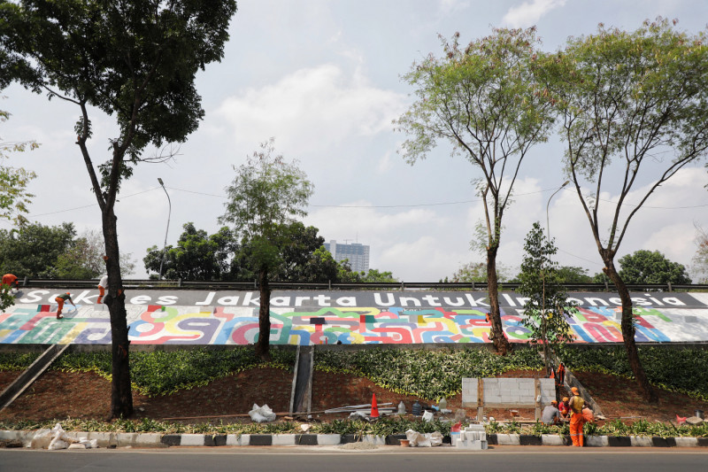 Petugas Penanganan Prasarana dan Sarana Umum (PPSU) Srengseng Sawah menyelesaikan penataan kawasan unggulan di Jalan Raya Lenteng Agung, Jagakarsa, Jakarta Selatan, Senin (11/9). Penataan kawasan tersebut diawali dengan pengerjaan pembatas jalan, penghijauan dengan tanaman lindung dan produktif, lalu dilanjut pengerjaan mural. Saat ini pengerjaan sudah mencapai 50 persen dan ditargetkan rampung pada 25 September mendatang.
