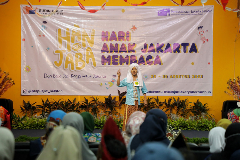 Suku Dinas Perpustakaan dan Kearsipan Jakarta Selatan menggelar kegiatan Hari Anak Jakarta Membaca (HANJABA) Tingkat Kota Jakarta Selatan Tahun 2023 di kantor Suku Dinas Perpustakaan dan Kearsipan Jakarta Selatan, Jalan Gandaria Tengah V 002/01, Kramat Pela, Kebayoran Baru, Jakarta Selatan, Selasa (29/8). Berbagai macam lomba diperlombakan yakni lomba menggambar dan mewarnai, lomba bercerita, lomba membacakan puisi dan lomba membuat komik strip, serta lomba pidato bahasa Indonesia.