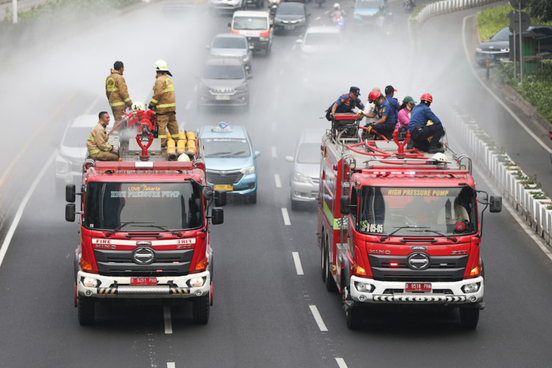 Dinas Penanggulangan Kebakaran dan Penyelamatan (Gulkarmat) DKI Jakarta menyemprotkan air di sepanjang Jalan Jenderal Sudirman dan Jalan M.H. Thamrin, Jakarta Pusat, Jumat (25/8). Penyemprotan air yang menggunakan lima unit mobil pemadam kebakaran tersebut untuk mengurangi dampak polusi udara di Jakarta.