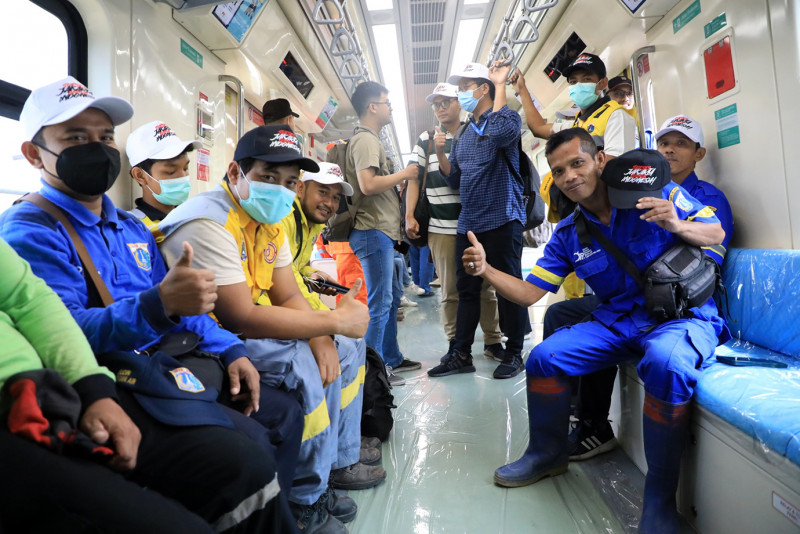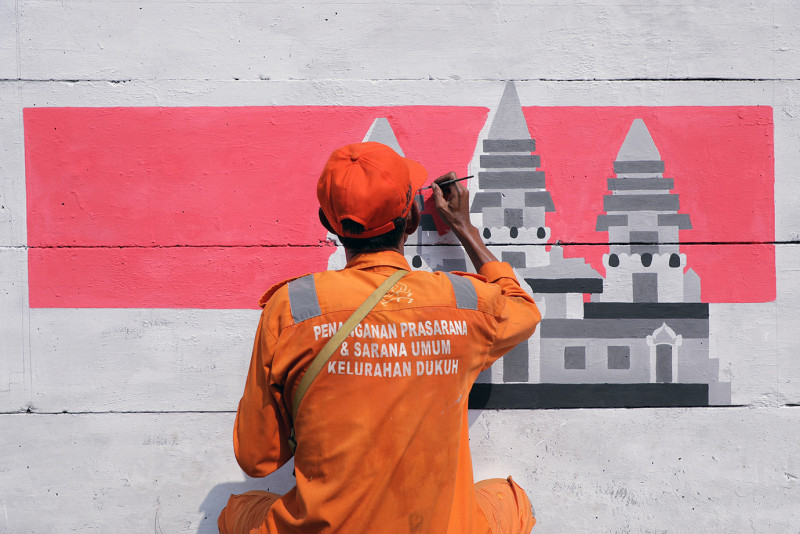 Petugas Prasarana dan Sarana Umum Kelurahan Dukuh membuat mural di Jalan H. Bokir Bin Dji\'un, Dukuh, Kramat Jati, Jakarta Timur, Jumat (25/8). Pembuatan mural tersebut dalam rangka menyambut KTT ASEAN 2023 di Jakarta.