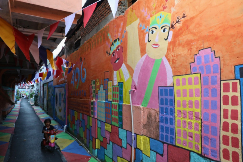 Melihat kawasan unggulan di Jalan Kebon Sirih Barat 1, Gg 7, RW 02/14, Kelurahan Kebon Sirih, Menteng Jakarta Pusat yang telah rampung dikerjakan, Selasa (15/8). Penataan kawasan dengan berbagai macam mural yang menggambarkan kota Jakarta ini merupakan hasil sinergitas dari warga RW 02, Karang Taruna dan PPSU Kebon Sirih.