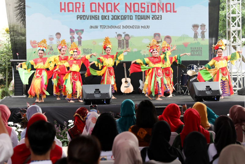 Penjabat (Pj) Ketua TP PKK DKI Jakarta, Mirdiyanti Heru bersama Ketua DWP DKI Jakarta, Endang Lestari Joko dan sejumlah pejabat di lingkungan Pemprov DKI Jakarta menghadiri peringatan Hari Anak Nasional (HAN) ke-39 tingkat provinsi di Agro Wisata Cilangkap, Cipayung, Jakarta Timur, Sabtu (29/7). Acara peringatan yang bertema \"Anak Terlindungi, Indonesia Maju\" tersebut diikuti oleh 1.000 anak-anak usia PAUD hingga SMP.