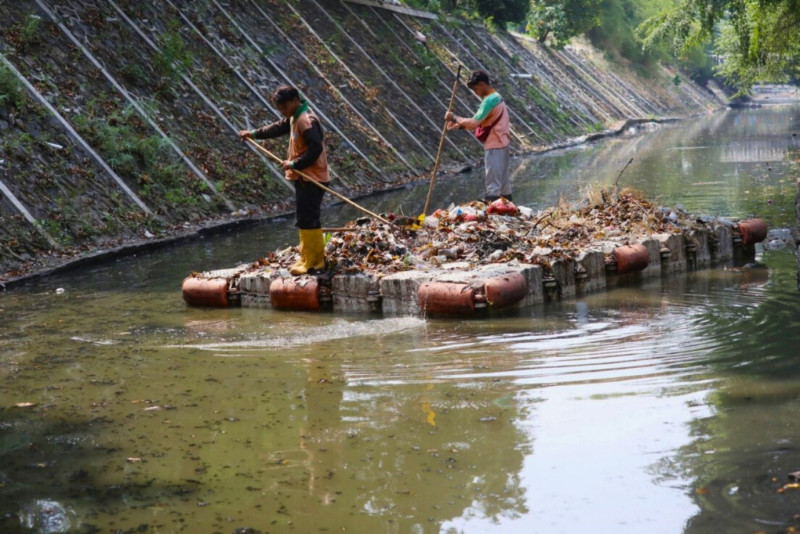Petugas Unit Pengelola Sampah (UPS) Badan Air Dinas Lingkungan Hidup (LH) DKI Jakarta melakukan pembersihan Kali PHB Bagunan Barat, Jalan Bangunan Timur, Kayu Putih, Rawamangun, Jakarta Timur, Jumat (28/7). Dalam satu hari biasanya petugas mengangkut tiga sampai empat kubik sampah dari kali. Pengerjaan ini dilakukan untuk menjaga kali terbebas dari sampah.
