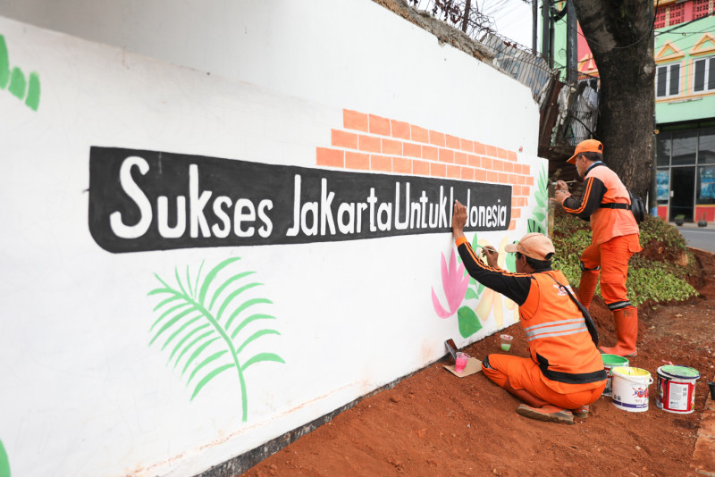 Sejumlah petugas Penanganan Prasarana dan Sarana Umum (PPSU) Kelurahan Bambu Apus menata kawasan unggulan di Jalan Mabes Hankam, Cipayung, Jakarta Timur, Jumat (28/7). Penataan yang melibatkan empat petugas PPSU tersebut merupakan penataan kawasan unggulan triwulan ketiga tahun 2023.