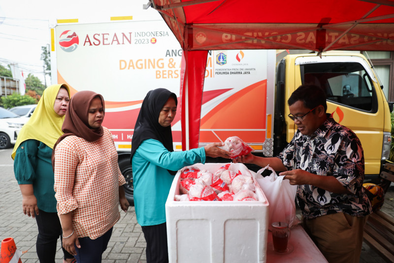 Perumda Dharma Jaya menggelar gerakan pangan murah daging ayam ras di halaman Kantor Kelurahan Cipinang Muara, Jatinegara, Jakarta Timur, Kamis (27/7). Daging ayam ras yang dijual berbobot 0,9 - 1 kilogram dengan harga Rp35 ribu per ekor. Penjualan daging ayam ras murah tersebar di berbagai lokasi sejak tanggal 18 Juli hingga 1 Agustus 2023.