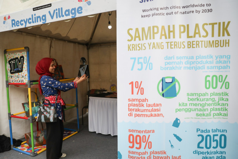 Sejumlah pengunjung melihat produk daur ulang dalam Festival Ekonomi Sirkular 2023 di Taman Menteng, Jakarta Pusat, Kamis (27/7). Kegiatan yang di gagas oleh Dinas Lingkungan Hidup (LH) DKI Jakarta berupaya mendorong masyarakat dapat terlibat aktif dalam ekonomi sirkular. Ekonomi sirkular sendiri bertujuan menciptakan pertumbuhan ekonomi dengan mempertahankan nilai produk, bahan dan sumber daya selama mungkin.