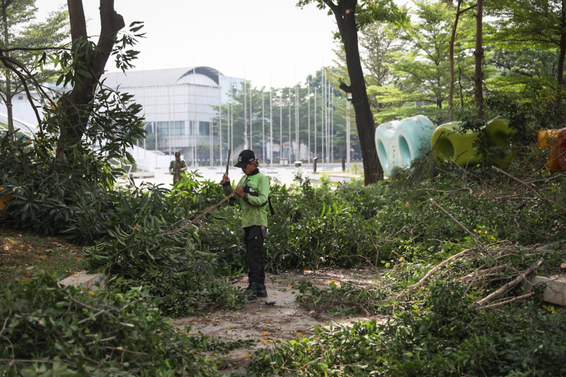 Sejumlah petugas Suku Dinas Pertamanan dan Hutan Kota (Sudin Tamhut) Jakarta Timur melakukan penopingan pohon di area Jakarta International Velodrome, Pulo Gadung, Jakarta Timur, Senin (24/7). Penopingan dilakukan terhadap pohon yang sudah lebat agar tidak membahayakan warga yang berolahraga.