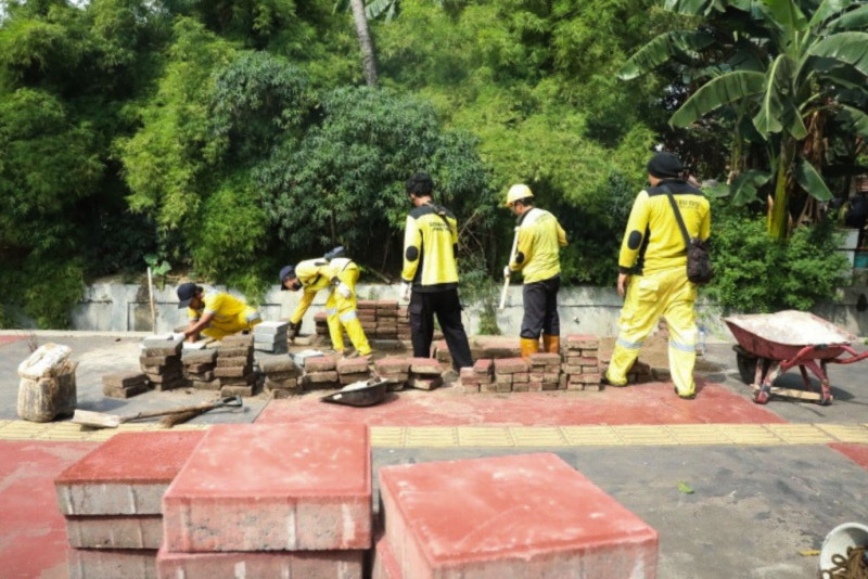 Tujuh petugas Bina Marga Kecamatan Duren Sawit melakukan perbaikan trotoar di Jalan I Gusti Ngurah Rai, Klender, Jakarta Timur, Senin (24/7). Perbaikan sepanjang empat meter dengan melakukan pergantian sejumlah paving block yang rusak dengan yang baru. Perbaikan ini dilakukan untuk menambah kenayamanan pejalan kaki yang melintas.