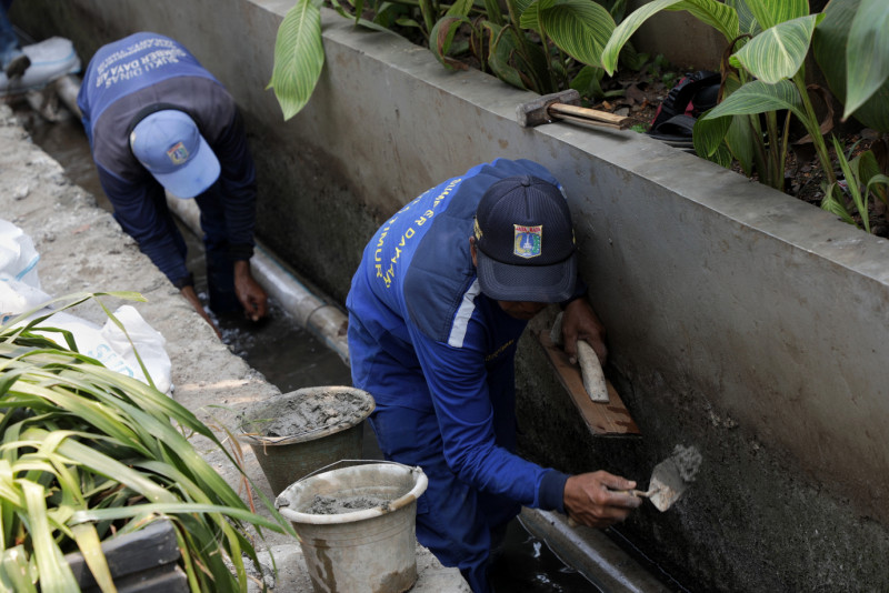 Petugas Suku Dinas Sumber Daya Air (Sudin SDA) Jakarta Timur melakukan perbaikan turap saluran air di Jalan Raya Poncol, Ciracas, Jakarta Timur, Jumat (21/7). Perbaikan turap saluran air sepanjang 24 meter dan tinggi 80 sentimeter ditargetkan rampung tiga hari mendatang .