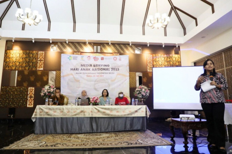 Komisi Penanggulangan AIDS (KPA) Provinsi DKI Jakarta bersinergi dengan sejumlah stateholders menggelar media briefing dalam rangka memperingati Hari Anak Nasional di Oemah Resto, Cempaka Putih, Jakarta Pusat, Kamis (20/7). Kegiatan media briefing bertema anak terlindungi, Indonesia Maju digelar untuk mengajak media berperan menyampaikan informasi anak dengan HIV yang selektif serta sarana edukasi kepada masyarakat.