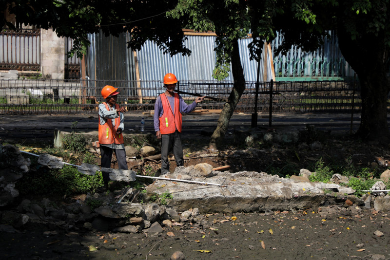 Petugas Dinas Bina Marga Kecamatan Menteng melakukan perbaikan kastin di Jalan Cik Ditiro, Menteng, Jakarta Pusat, Kamis (20/7). Perbaikan dilakukan oleh enam petugas Bina Marga Kecamatan Menteng karena kanstin sudah rusak dimakan usia.