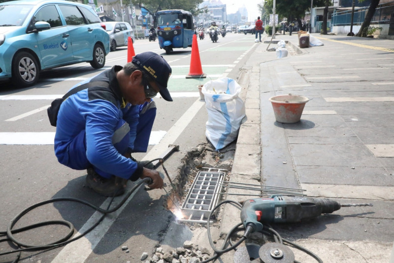Petugas Suku Dinas Sumber Daya Air (Sudin SDA) Jakarta Pusat melakukan perbaikan penutup tali air di Jalan Kramat Raya, Senen, Jakarta Pusat, Selasa (18/7). Perbaikan penutupan tali air dengan menggunakan grill di sepanjang Jalan Kramat Raya hingga Jalan Salemba Raya dengan target 100 grill penutup tali air. Perbaikan ini dilakukan agar sampah-sampah bisa tersaring dan tidak masuk ke dalam saluran.