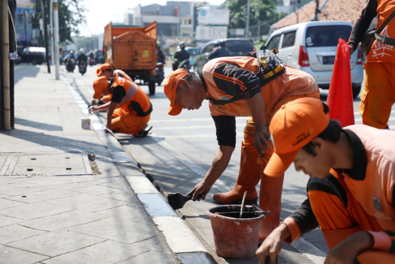 Petugas Penanganan Prasarana dan Sarana Umum (PPSU) Kelurahan Kampung Melayu melakukan pengecatan kanstin trotoar di Jalan Jatinegara Barat, Jatinegara, Jakarta Timur, Rabu (19/7). Pengerjaan sepanjang satu kilometer ini mengerahkan 10 petugas PPSU.